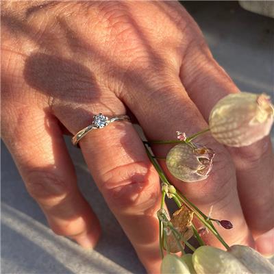 Ring crafted from 18kt white gold, natural tint, set with 1x0,15ct natural diamond, brilliant cut.