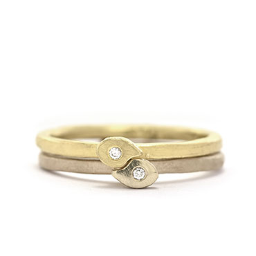 Stapelringen vervaardigd in 18kt wit goud, natuurlijke tint en geel goud, gezet met 2x,01ct natuurlijke diamanten, briljant geslepen.